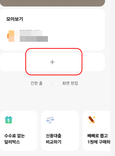 카카오뱅크 앱을 먼저 설치한 후 가입 절차를 완료하세요. 가입이 완료되면 홈 화면으로 이동한 뒤, 스크롤을 내려 ‘+’ 버튼을 찾아 클릭합니다.