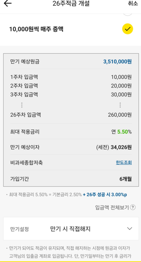 26주 적금의 경우, 기본 금리 외에도 7주와 26주 연속 자동이체 성공 시 우대금리가 적용됩니다. 자동이체 요일마다 차이가 생길 수 있으며, 주말에 납입을 시작하면 주중보다 다소 보유 기간이 길어질 수 있습니다.
