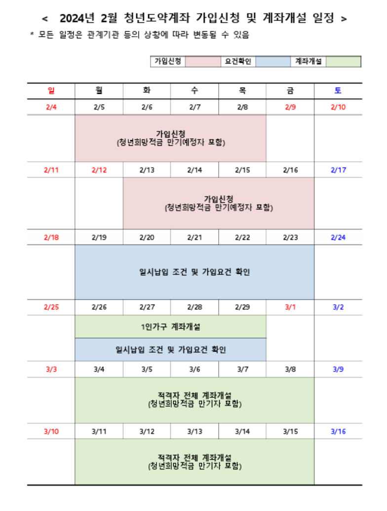 아래표는 2024년 2월의 신청 및 계좌 개설 일정표입니다. 이 절차는 매월 다음과 같이 계속됩니다.