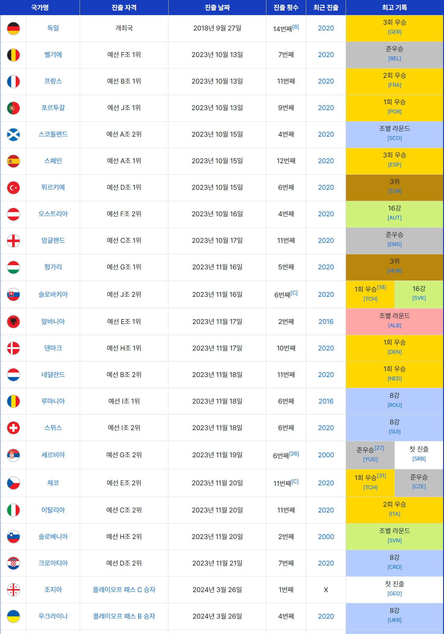 상황: 스웨덴의 몰락으로 조별 예선을 수월하게 통과. 지난 유로에서의 선전을 이어갈 수 있을지 주목됨.